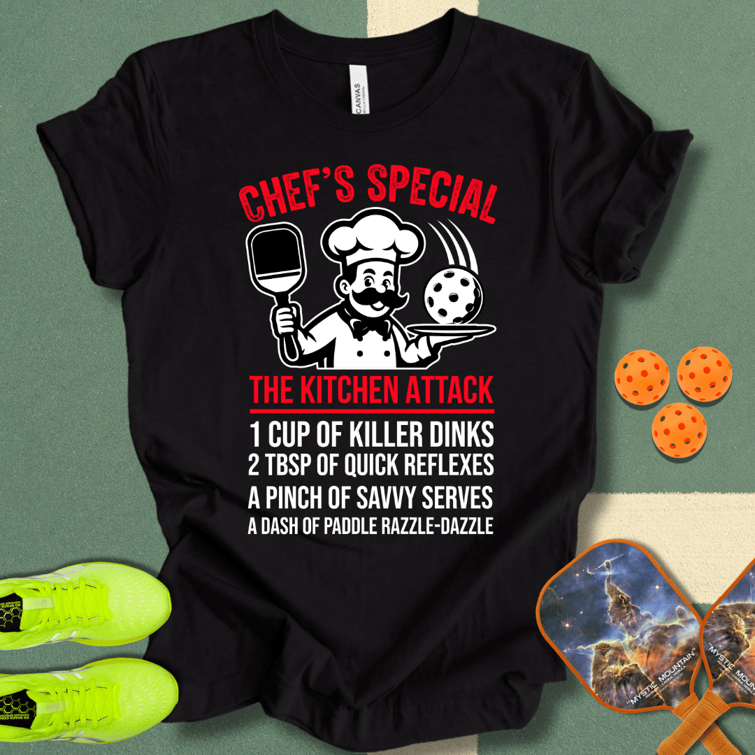 Cook up some wins on the court with our "Chef's Special" T-Shirt. Made from soft, breathable fabric, this tee is perfect for pickleball enthusiasts who mix a little kitchen humor with their game. Serve up dinks, aces, and a dash of style every time you play—this is your secret recipe for victory!