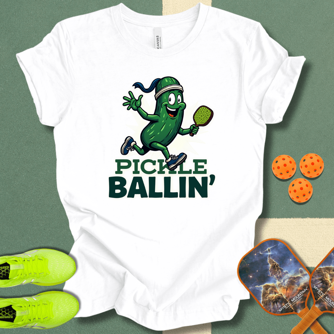A striking mix of electric blue and vivid green paints the text 'Pickle Ballin'' in a sleek font, cut through by a minimalist pickleball and court silhouette that uses geometric flair and negative space, set against a stylish white backdrop.