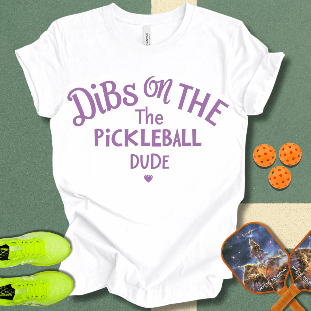 Catch a playful vibe with the phrase "Dibs on the Pickleball Dude" whimsically arched in lavender against a luminous white backdrop, highlighted by a dark purple outline and a charming racket and ball illustration beneath.