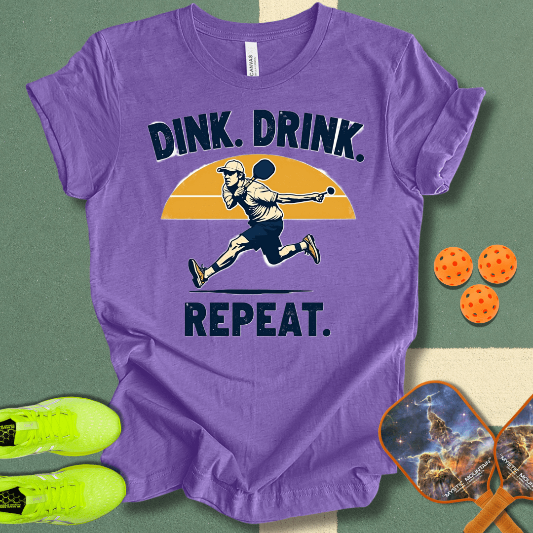 A retro pickleball player swings with vibrant energy as bold words "Dink. Drink. Repeat." in a vintage font crown the design, harmoniously blending competition and style on a crisp white canvas.