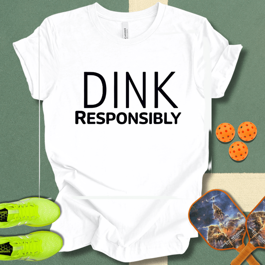 Dink Responsibly features playful bold text infused with a lively green-to-yellow gradient reminiscent of pickleball, set against a minimalist pickleball paddle graphic that highlights movement with sharp lines and dynamic diagonal orientation.