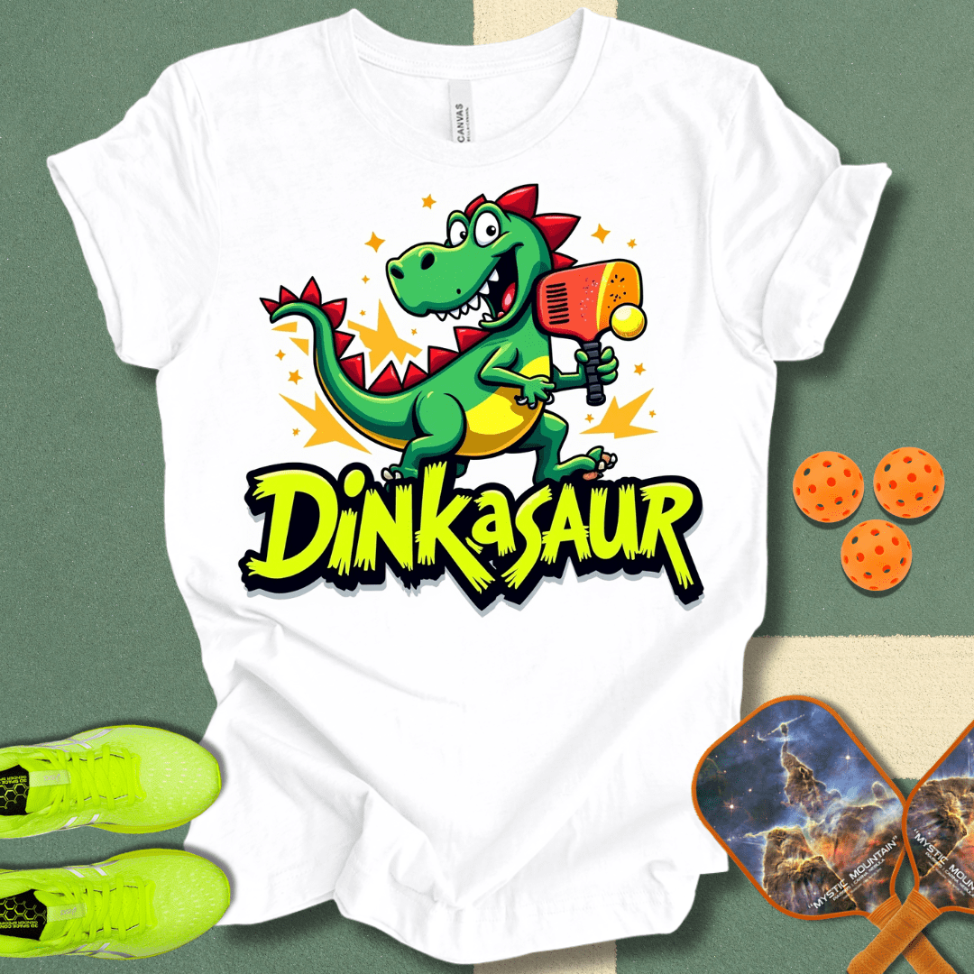 An animated masterpiece with a vibrant cartoon dinosaur exuberantly hitting a pickleball, crowned with 'Dinkasaur' in vivid graffiti style, standing out against a crisp white backdrop for a playful, youthful appeal.