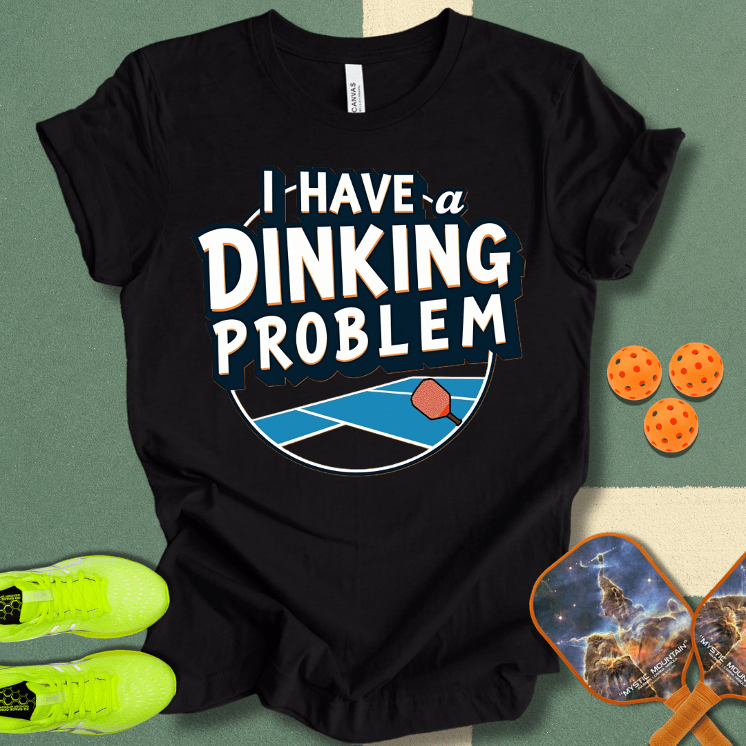 "I Have a Dinking Problem" captures nostalgic charm in a lively retro font, set above a vividly stylized pickleball court in harmonious colors of orange and blue, delivering a trendy and eye-catching t-shirt design.
