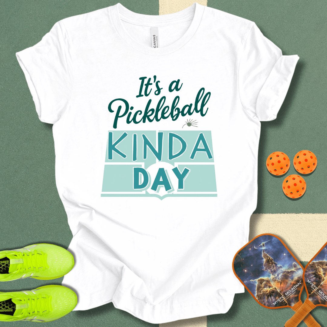 "It's a Pickleball Kinda Day" pops in casual, airy script above an abstract pickleball court rendered in cool blues and greens, promising a breezy sport-filled day.