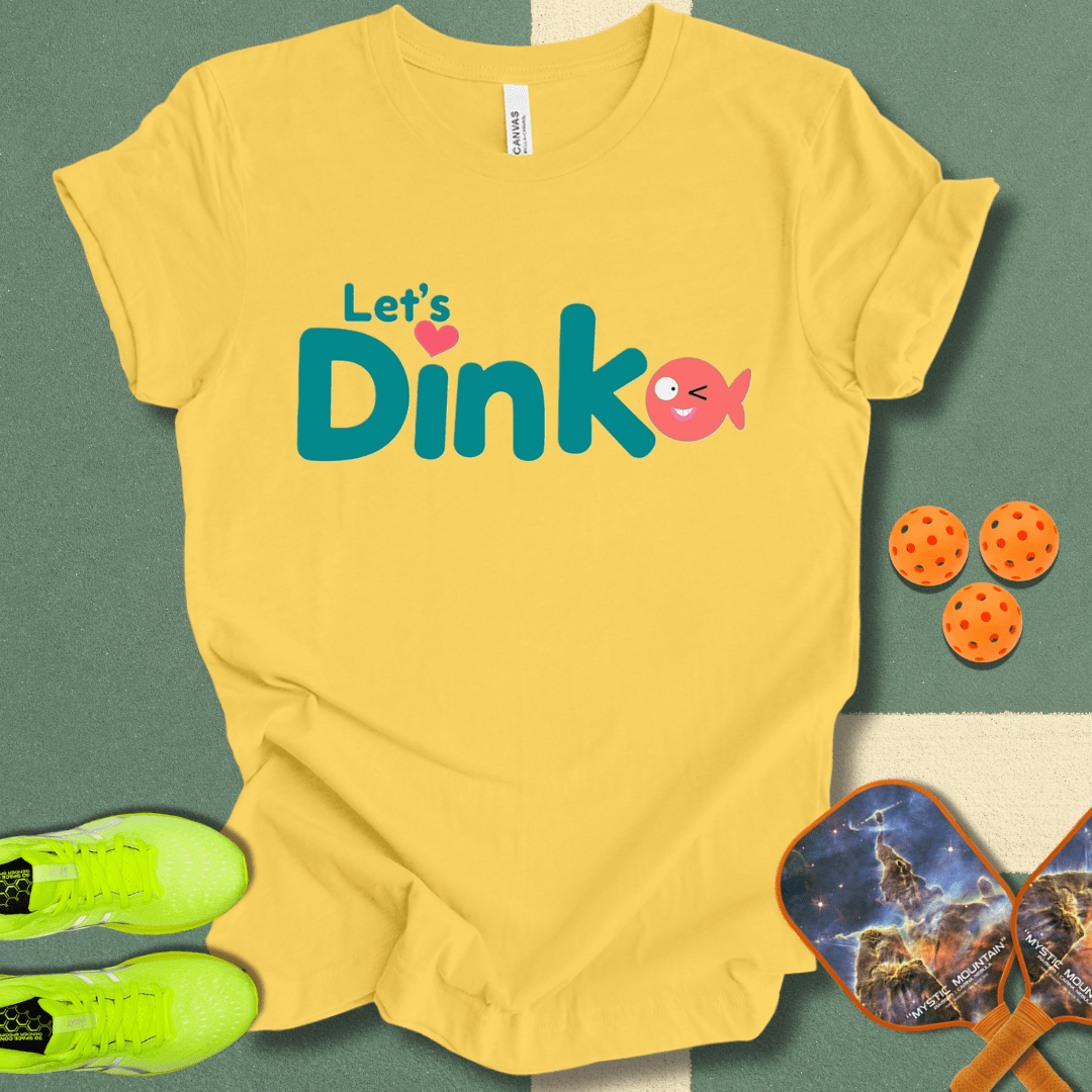 "Let's Dink" captivates with a bold turquoise font, subtly arched in a cool 3D style. A cheeky coral wink face adds humor and charm, creating an engaging design with striking contrasts and captivating minimalist balance.