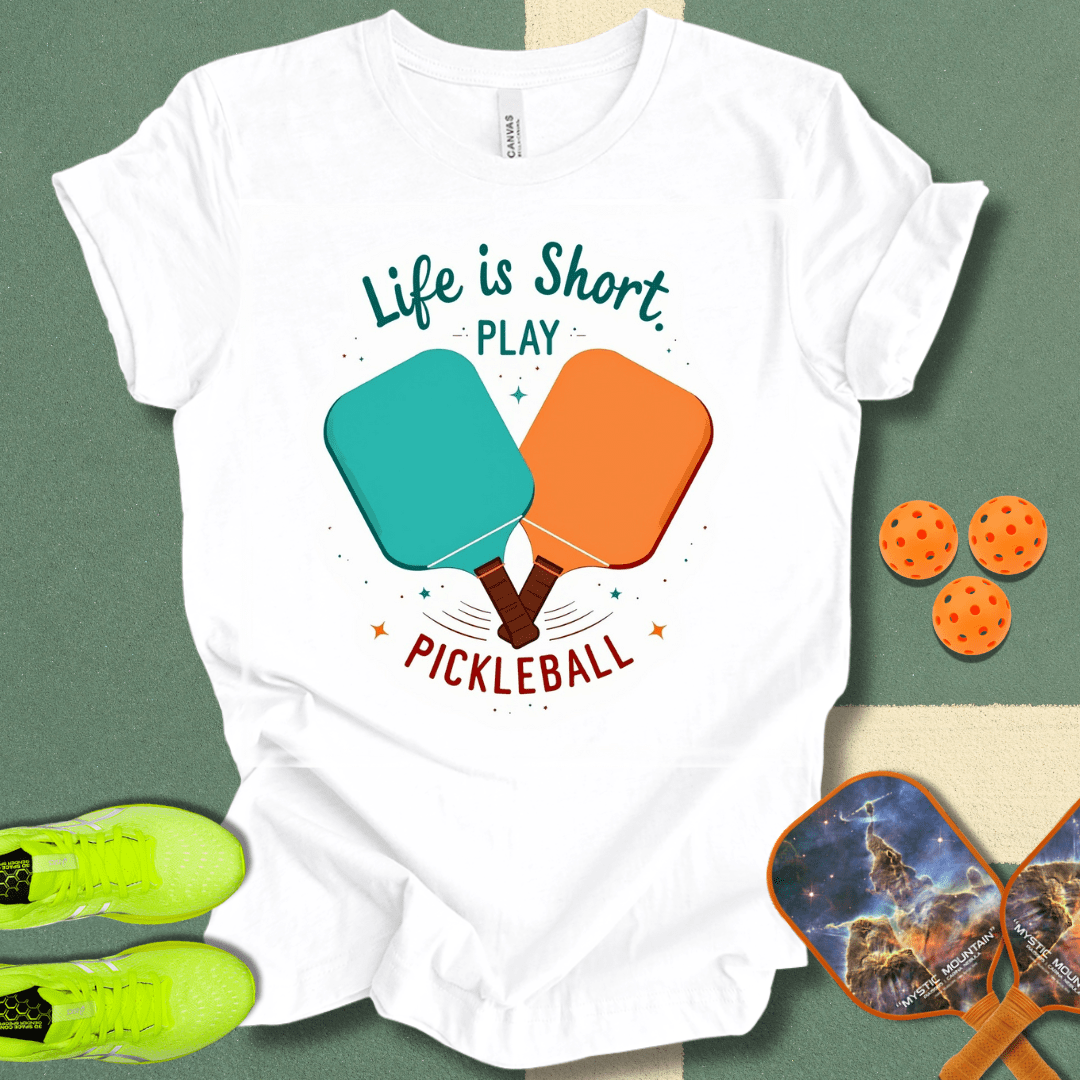 Capturing the vibrant spirit of pickleball, this striking design showcases the playfulness of life in bold typography with crossed paddles bursting in teal and orange hues, set against a stark white backdrop for ultimate pop.