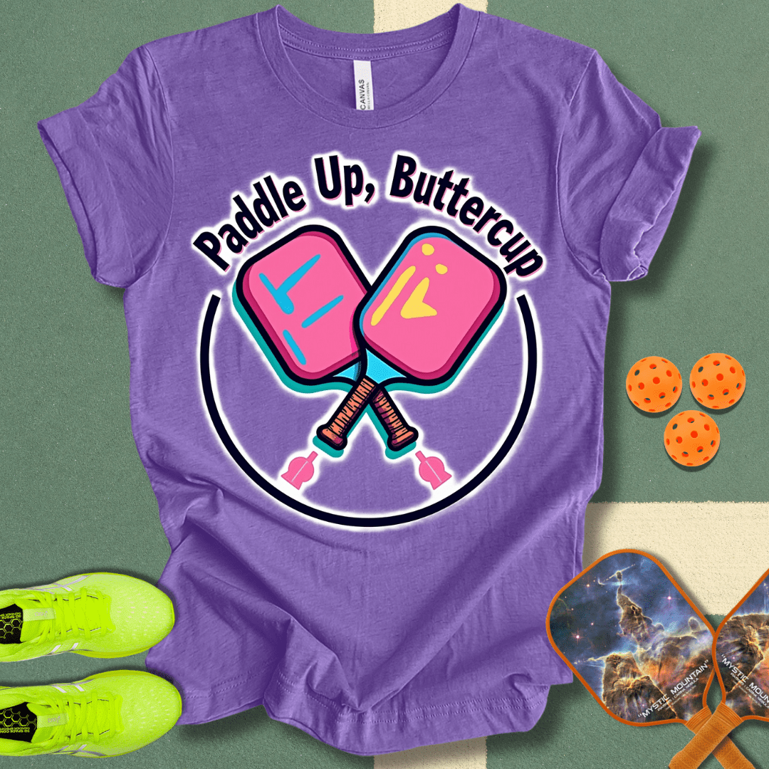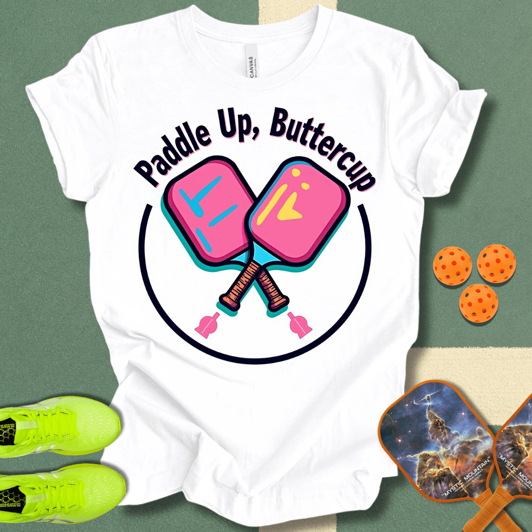 Embrace nostalgia with a bold, circular "Paddle Up, Buttercup" design featuring crossed pickleball paddles in vibrant, 80s colors and geometric patterns—a perfect fusion of retro style and modern flair.