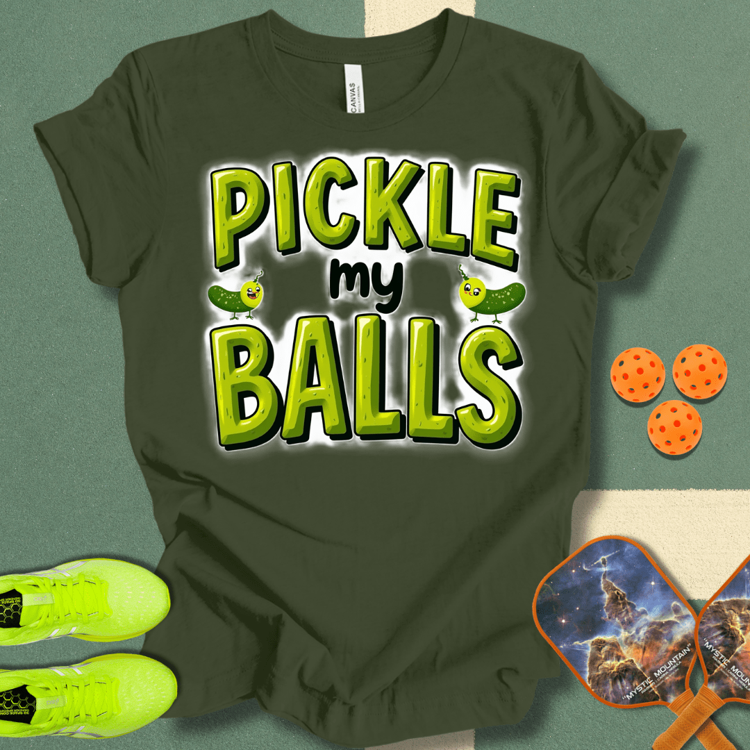 This playful design merges humor and fun by highlighting the phrase "Pickle my Balls" in vibrant, bold typography with a delightful pickle texture. Cartoon pickles with exaggerated expressions frame the text, set against a backdrop of lively greens and yellows.