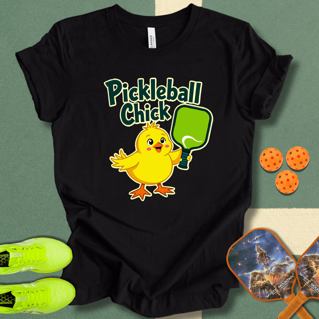 A vibrant waist-up design features a cheerful yellow chick holding a bright green pickleball paddle, topped with "Pickleball Chick" in a fun, handwritten style, blending joyful energy and visual vibrancy.