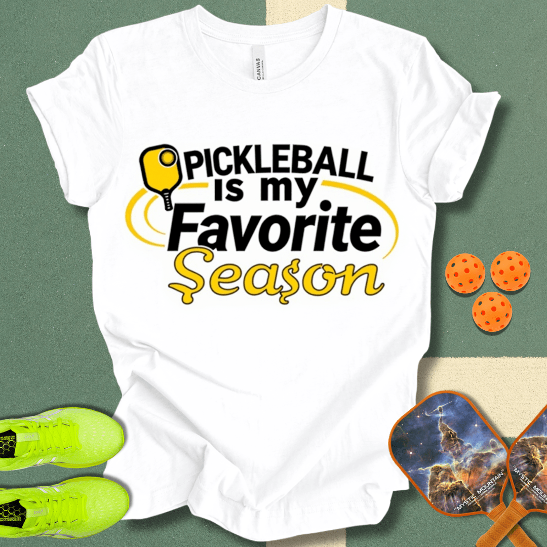 Discover a sleek and trendy tee showcasing 'Pickleball is my Favorite Season' in bold sans-serif atop a dynamic pickleball illustration, with vibrant black and yellow hues on a crisp white backdrop, perfect for enthusiasts.