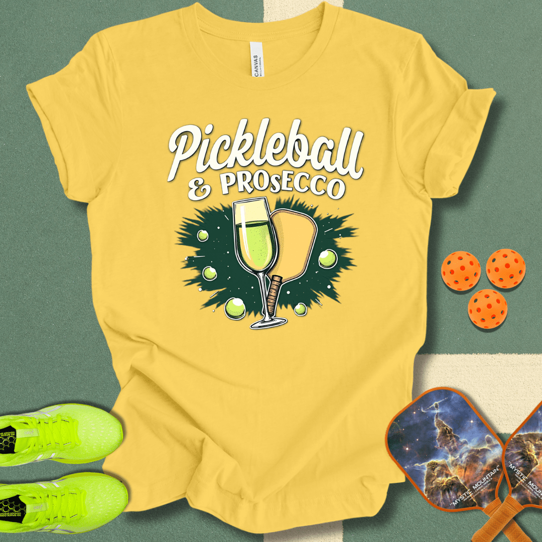 Embrace sophistication with this trendy t-shirt showcasing 'Pickleball and Prosecco' in a unique font above an elegant illustration of a pickleball paddle intertwined with a half-full glasses. The design's vibrant greens, golden champagnes, and deep navies offer perfect balance, creating an appealing look that's both playful and chic.