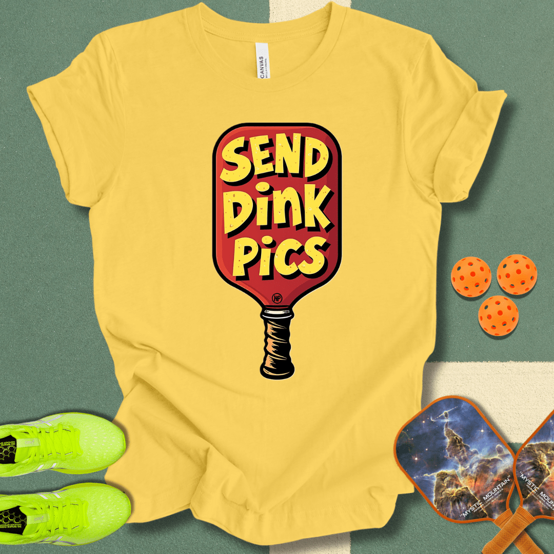 This dynamic design juxtaposes a grunge-style 'Send Dink Picks' at its base with a striking geometric pickleball paddle and ball, unified by a metallic silver, black, and neon green palette that lends a modern, speed-driven allure to the layout.